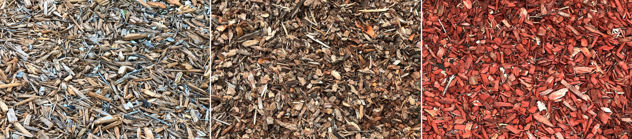 Three styles and colors of chipped bark mulch 15May2021 • 2560 × 566 • Test Three styles and colors of chipped bark mulch used to suppress wild vegetation in designed landscapes. Photos © RJH. Three styles and colors of chipped bark mulch