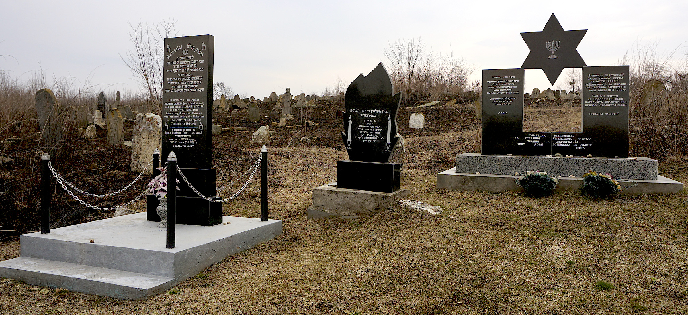 Black color featured prominently 19Mar2021 • 2400 × 1100 • Test Black color featured prominently in three community and family Holocaust memorials in a Jewish cemetery in Sharhorod (Vinnytsia oblast). Photo © RJH. Black color featured prominently