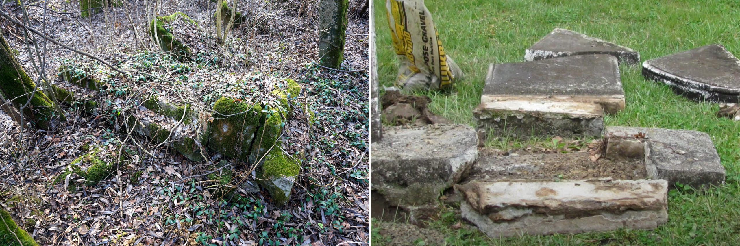 Concrete causing damage to natural stone in settings from before WWII in the Jewish cemetery of Rozhniativ and more recently at a cemetery in the US. Photos © RJH and Jonathan Appell via the NCPTT.