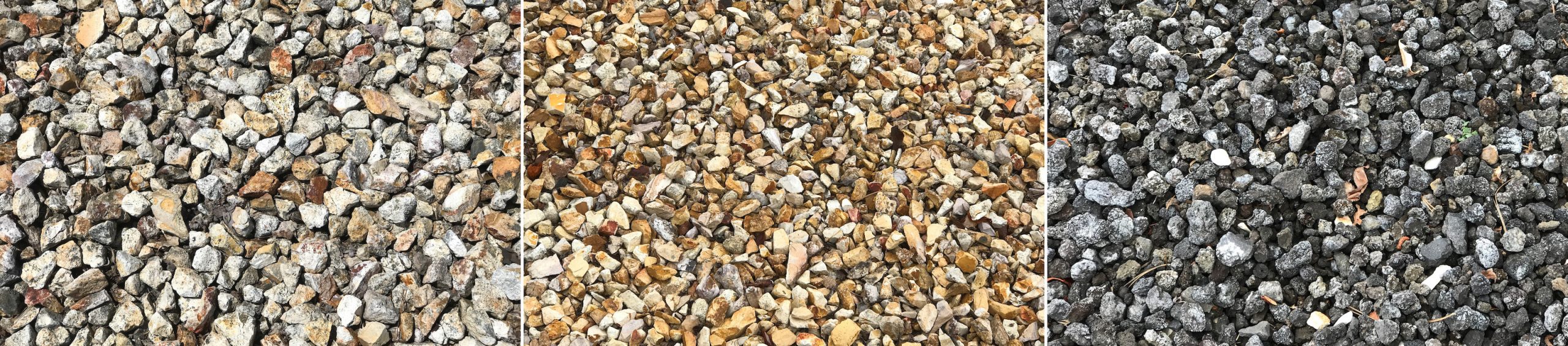 Three styles and colors of crushed rock used to suppress wild vegetation in designed landscapes. Photos © RJH.