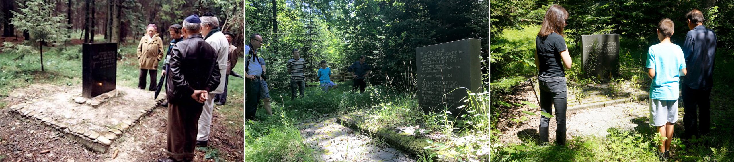 A mass grave memorial in the forest near Deliatyn (Ivano-Frankivsk oblast) seen at its unveiling in newly-independent Ukraine 1992, and during a visit in 2017. Sources: Yad Vashem and RJH.