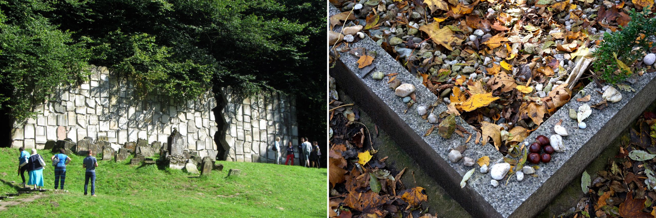 Extremes of scale 28Feb2021 • 2560 × 851 • Test Extremes of scale: the enormous monument at the new Jewish cemetery in Kazimeierz Dolny, and memorial pebbles left by visitors to the grave of Arnošt Lustig and his family in the new Jewish cemetery in Prague. Photos © RJH. Extremes of scale