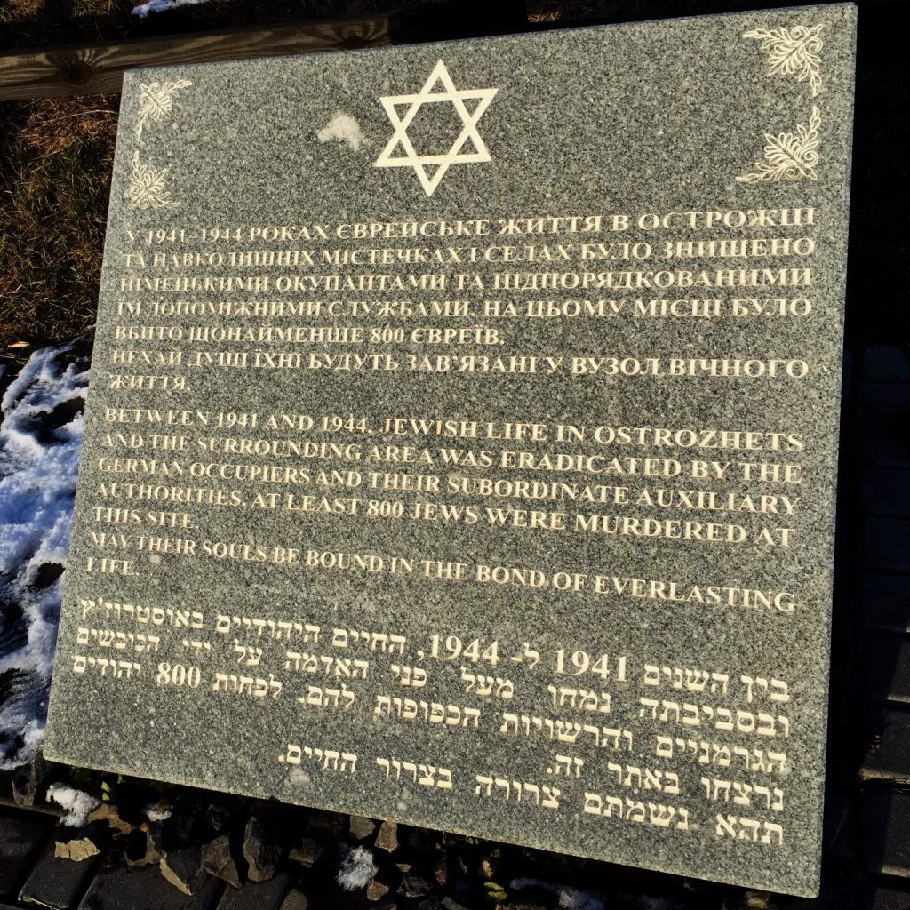 A trilingual stone plaque incorporated into a mass grave memorial near Ostrozhets (Rivne oblast). Source: Volodymyr Muzychenko.