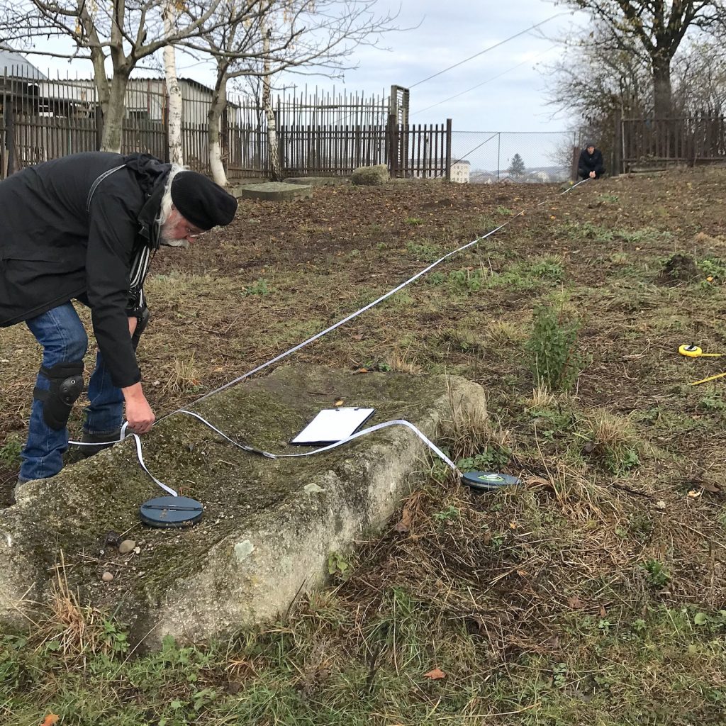 Tape measures used to triangulate the location of objects in the old Jewish cemetery of Rohatyn. Photo © RJH.