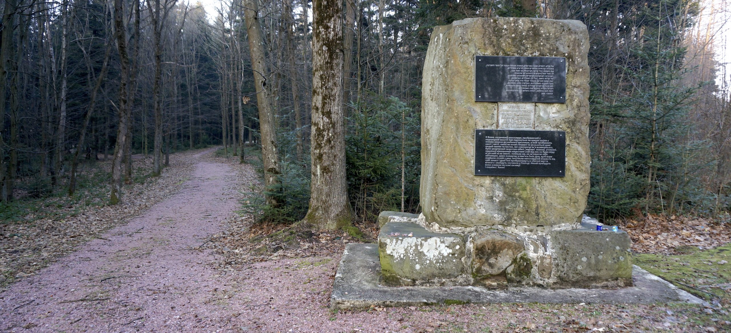 A rock-form memorial monument and pathway sign at the Drohobych forest mass grave complex 05Mar2021 • 2560 × 1166 • Test A rock-form memorial monument and pathway sign at the Drohobych forest mass grave complex. Photo © RJH. A rock-form memorial monument and pathway sign at the Drohobych forest mass grave complex