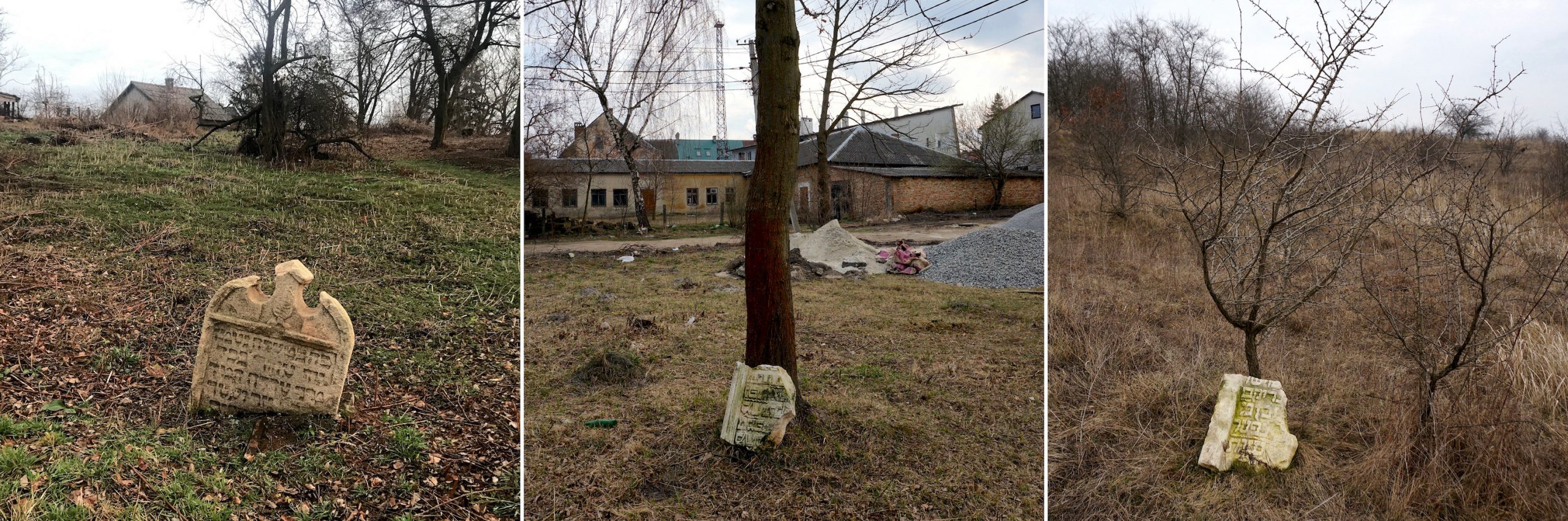 Single headstone fragments serving as memorial markers for entire Jewish cemeteries in western Ukraine: Yavoriv old, Kamianka-Buzka old, Vybranivka. Photos © RJH.