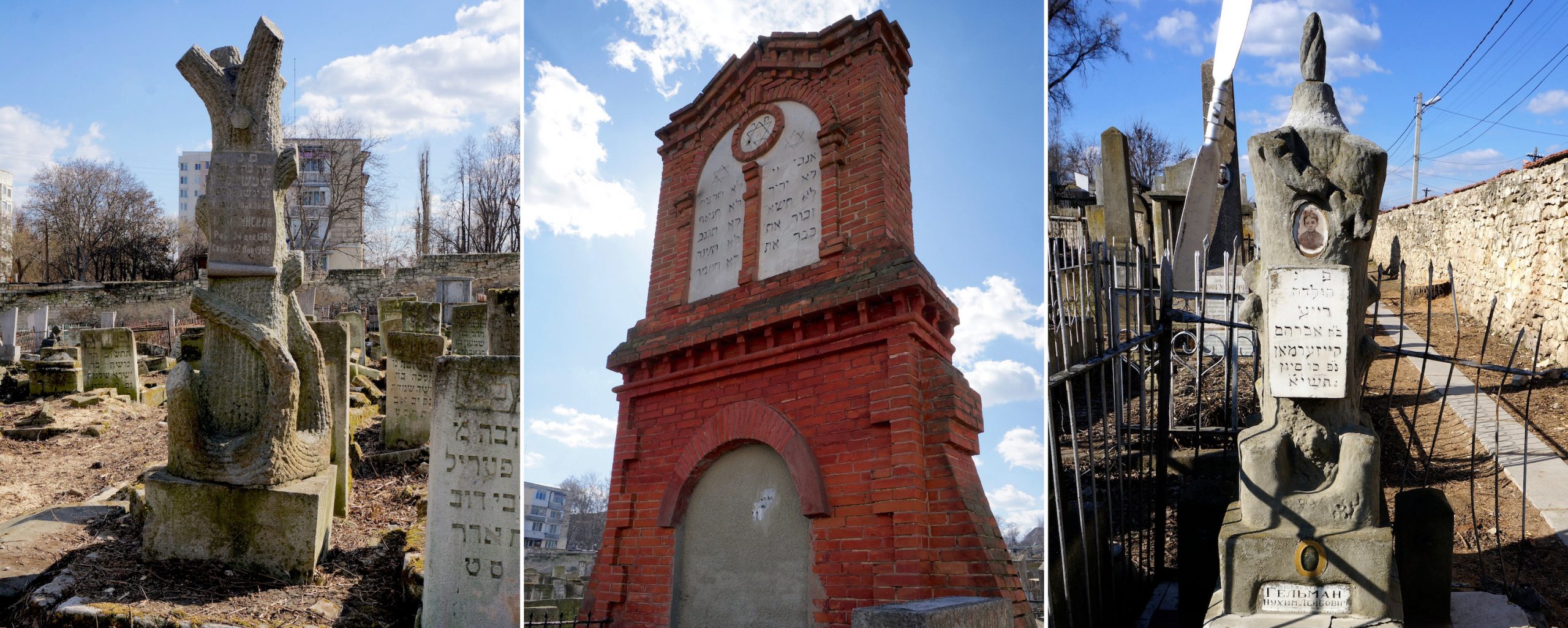 Tree, tablet, and flame symbols at individual prewar graves in the Jewish cemetery of Chișinău, Moldova. Photos © RJH.